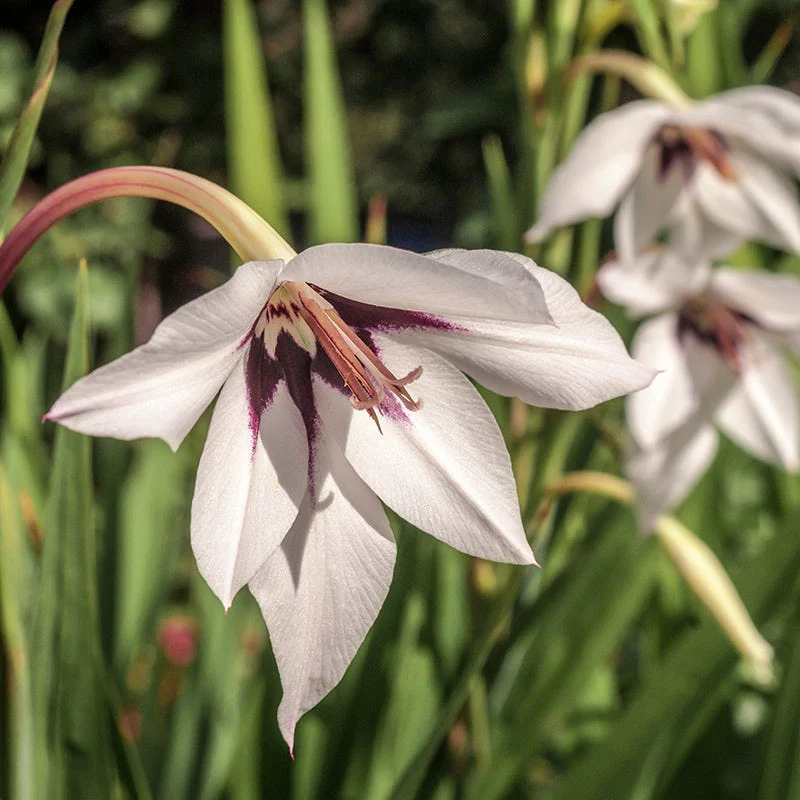 Gladiolus acindanthera (Peacock Orchid) is beautiful South African wild flower. This Gladiola blooms in mid-summer with graceful spikes of flowers. They have a strong, sweet fragrance and make wonderful bouquets. Cold hardy in zones 8-10. In colder zones lift the bulbs in fall and store in a cool place over the winter.